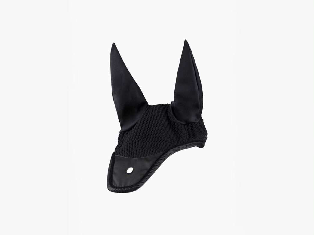 Fly hat with a gorgeous velvet piping and a ruffle satin binding. The ears are elastic and made of a stretchy, breathable, antimicrobial quick-dry material. The elastic fabric at the ears makes the fly hat fit all types of horses. It quickly transports moisture and sweat away during the whole ride. The fly hat has a classic, crocheted bottom, double piping, and the lower part of the fly hat is covered with shiny, dirt-repellent material.